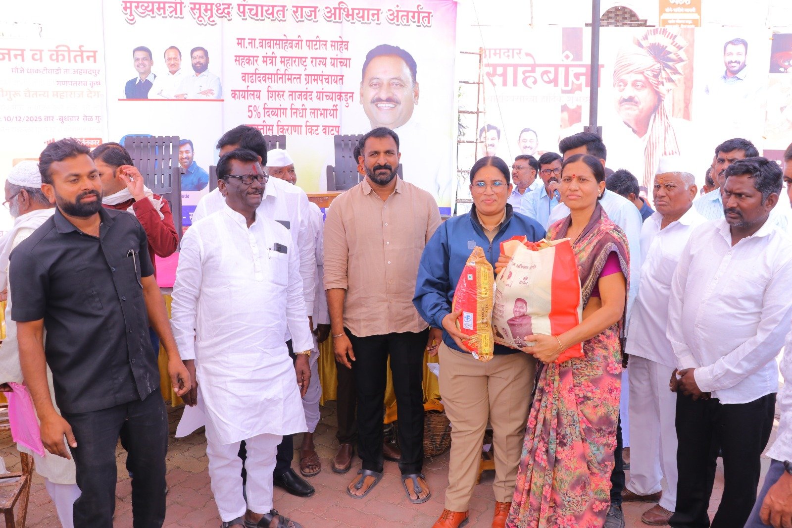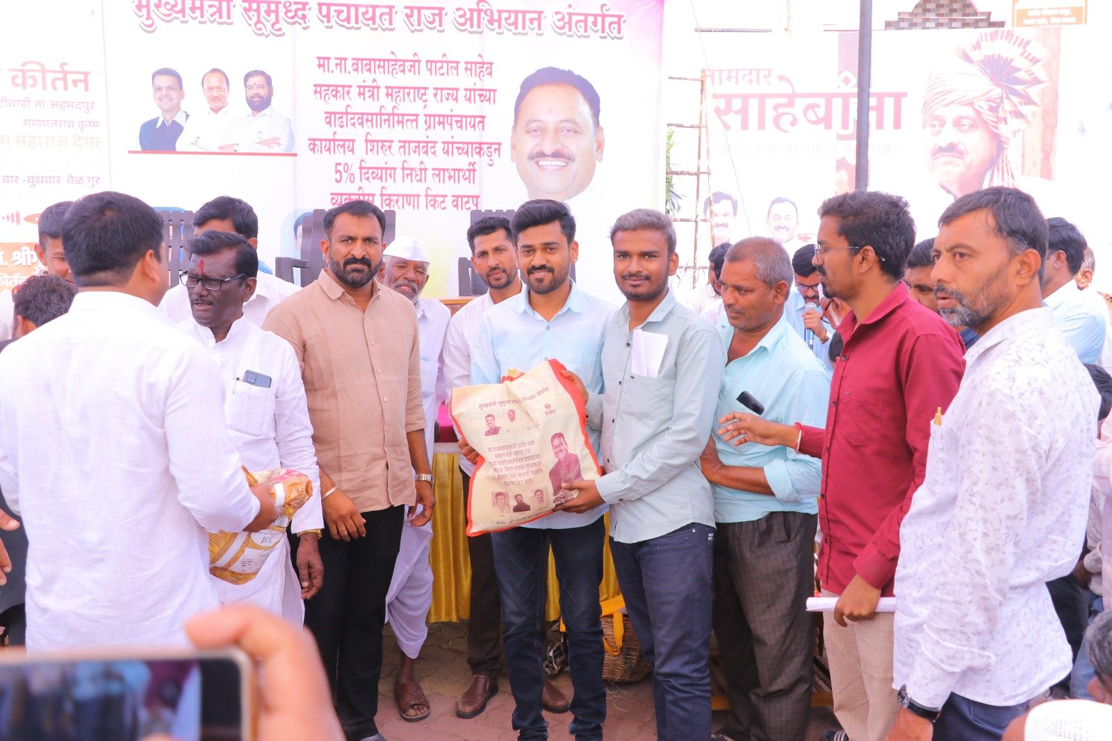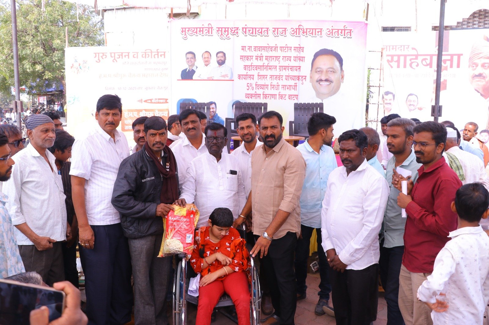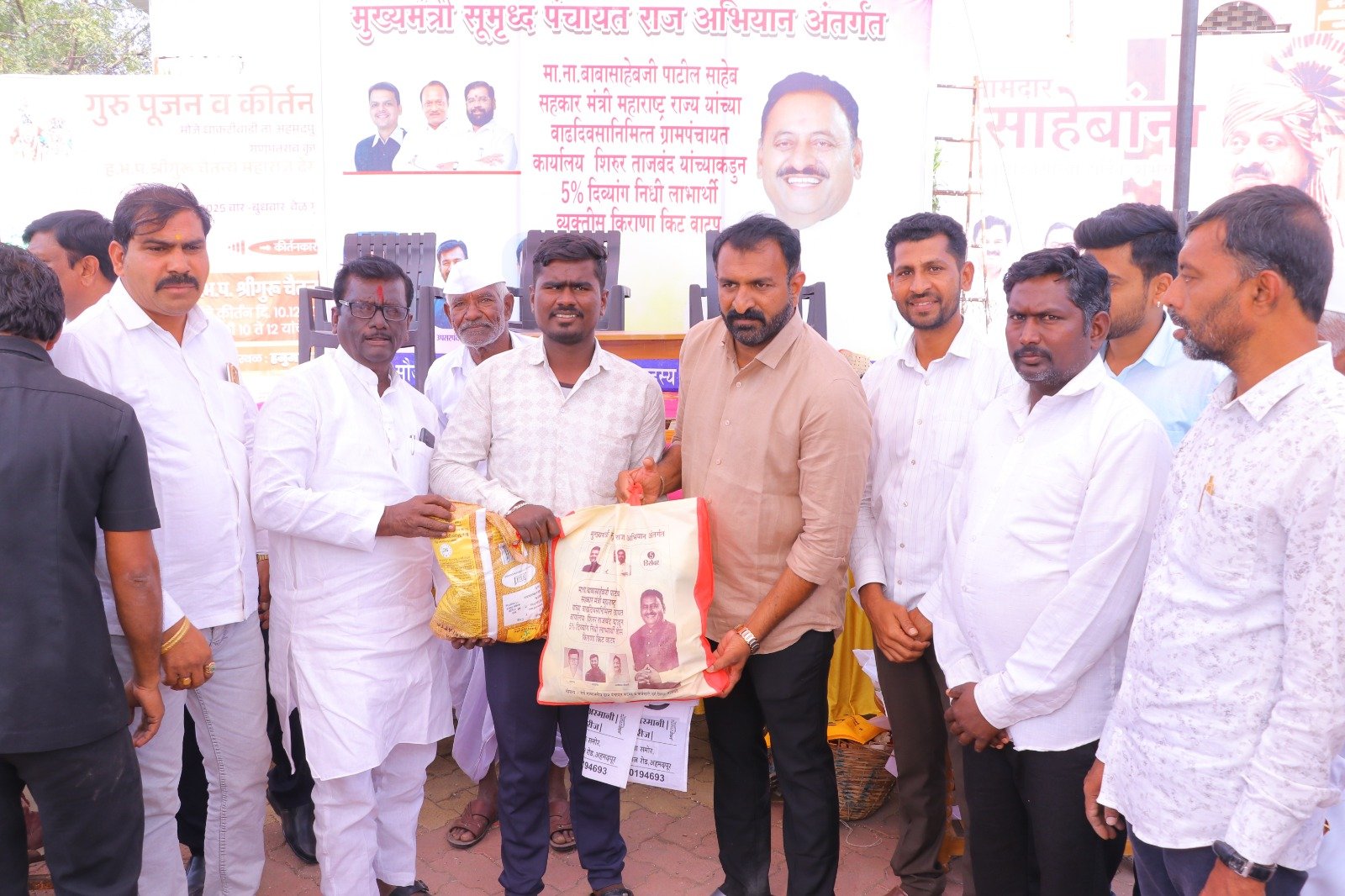 मुख्यमंत्री समृद्ध पंचायत राज अभियाना अंतर्गत ग्रामपंचायत शिरूर ताजबंद ता-अहमदपूर जि-लातूर येथे महाराष्ट्रराज्याचे सहकार मंत्री माननीय नामदार श्री.बाबासाहेबजी पाटील साहेब यांच्या वाढदिवसा निमित्त 5% दिव्यांग बांधवाना किराणा किटचे वाटप माननीय नामदार श्री.बाबासाहेबजी पाटील साहेब यांच्या हस्ते करण्यात आले. यावेळी सरपंच मा.श्री.मच्छिंद्र वाघमारे साहेब, उपसरपंच सुरजभैय्या पाटील साहेब, ग्रामपंचायत अधिकारी प्रशांत घुगे साहेब, ग्रा,पं, सदस्य युवराजभैया पाटील, रणधीर पाटील, गजेंद्र वलसे, किशन कापसे, शुभम सारोळे, रामेश्वर येणुरे, संभाजी सरवदे, किशोर वाघमारे, अनिलभाऊ लामतुरे, ग्राम पंचायत प्रशिक्षनार्थी अधिकारी राठोड साहेब, सर्व ग्रामपंचायत सदस्य गावकरी व दिव्यांग बांधव उपस्थित होते.