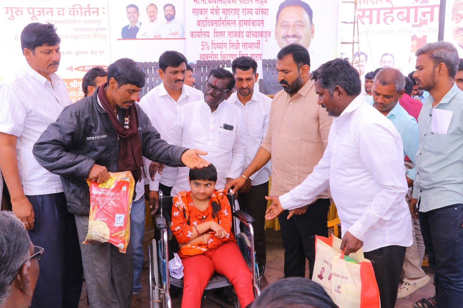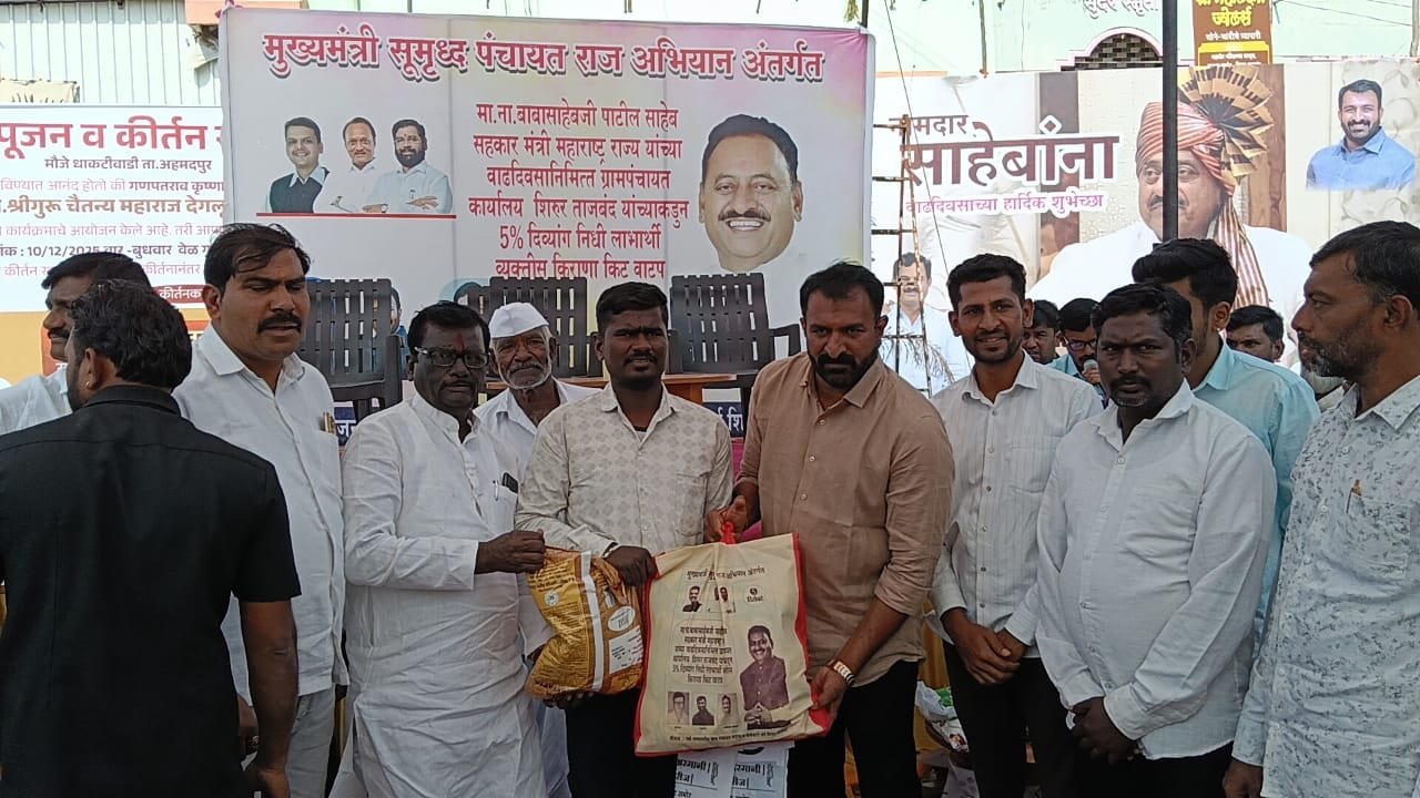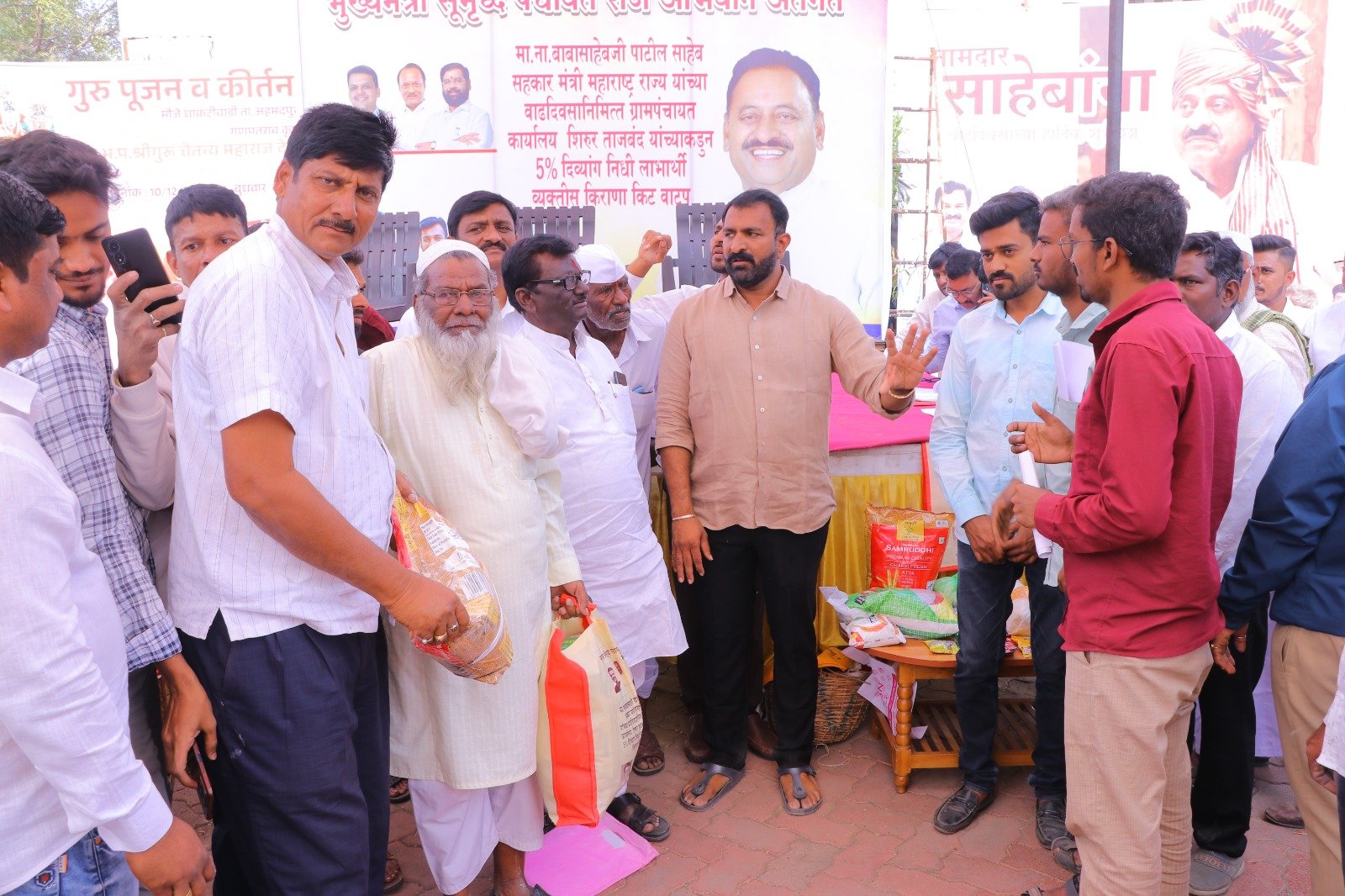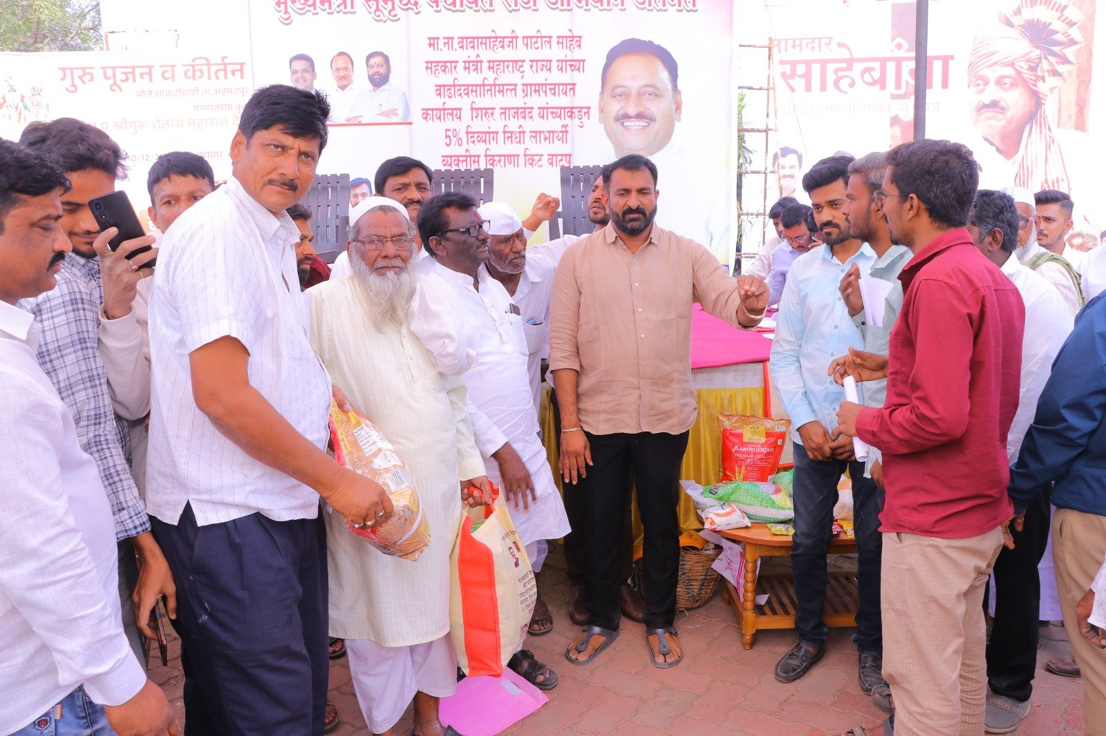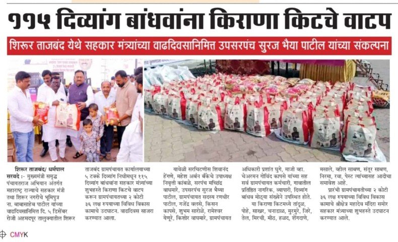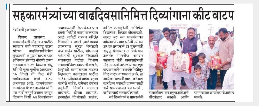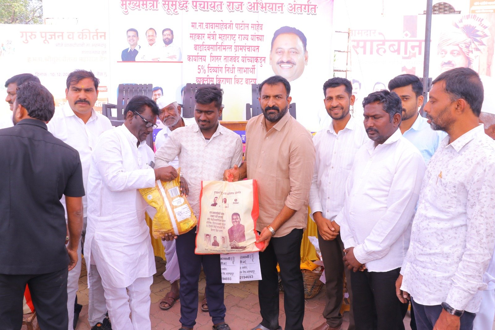 मुख्यमंत्री समृद्ध पंचायत राज अभियाना अंतर्गत ग्रामपंचायत शिरूर ताजबंद ता-अहमदपूर जि-लातूर येथे महाराष्ट्रराज्याचे सहकार मंत्री माननीय नामदार श्री.बाबासाहेबजी पाटील साहेब यांच्या वाढदिवसा निमित्त 5% दिव्यांग बांधवाना किराणा किटचे वाटप माननीय नामदार श्री.बाबासाहेबजी पाटील साहेब यांच्या हस्ते करण्यात आले. यावेळी सरपंच मा.श्री.मच्छिंद्र वाघमारे साहेब, उपसरपंच सुरजभैय्या पाटील साहेब, ग्रामपंचायत अधिकारी प्रशांत घुगे साहेब, ग्रा,पं, सदस्य युवराजभैया पाटील, रणधीर पाटील, गजेंद्र वलसे, किशन कापसे, शुभम सारोळे, रामेश्वर येणुरे, संभाजी सरवदे, किशोर वाघमारे, अनिलभाऊ लामतुरे, ग्राम पंचायत प्रशिक्षनार्थी अधिकारी राठोड साहेब, सर्व ग्रामपंचायत सदस्य गावकरी व दिव्यांग बांधव उपस्थित होते.