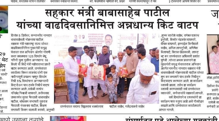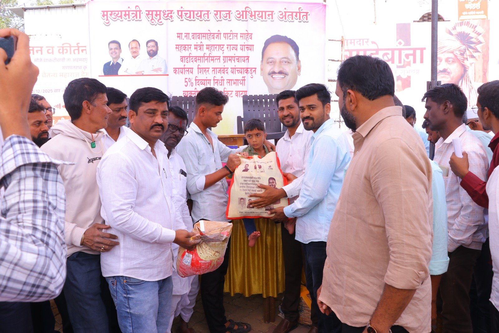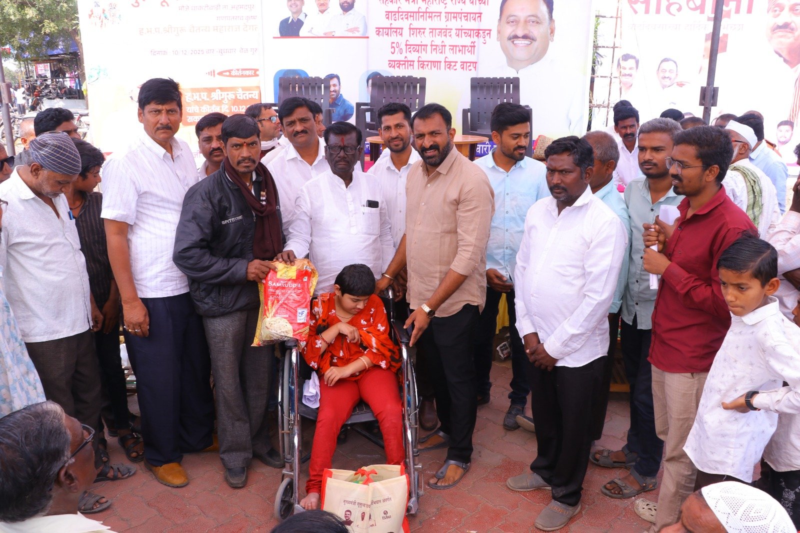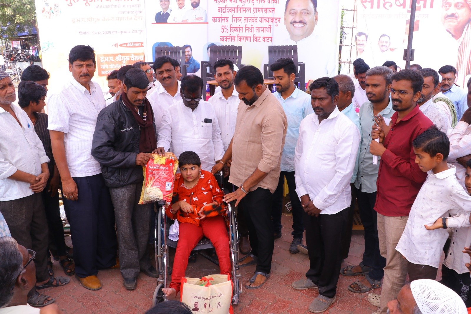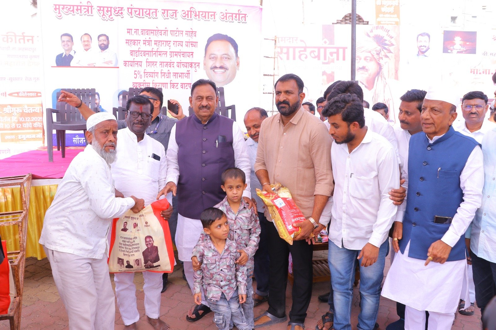 मुख्यमंत्री समृद्ध पंचायत राज अभियाना अंतर्गत ग्रामपंचायत शिरूर ताजबंद ता-अहमदपूर जि-लातूर येथे महाराष्ट्रराज्याचे सहकार मंत्री माननीय नामदार श्री.बाबासाहेबजी पाटील साहेब यांच्या वाढदिवसा निमित्त 5% दिव्यांग बांधवाना किराणा किटचे वाटप माननीय नामदार श्री.बाबासाहेबजी पाटील साहेब यांच्या हस्ते करण्यात आले. यावेळी सरपंच मा.श्री.मच्छिंद्र वाघमारे साहेब, उपसरपंच सुरजभैय्या पाटील साहेब, ग्रामपंचायत अधिकारी प्रशांत घुगे साहेब, ग्रा,पं, सदस्य युवराजभैया पाटील, रणधीर पाटील, गजेंद्र वलसे, किशन कापसे, शुभम सारोळे, रामेश्वर येणुरे, संभाजी सरवदे, किशोर वाघमारे, अनिलभाऊ लामतुरे, ग्राम पंचायत प्रशिक्षनार्थी अधिकारी राठोड साहेब, सर्व ग्रामपंचायत सदस्य गावकरी व दिव्यांग बांधव उपस्थित होते.