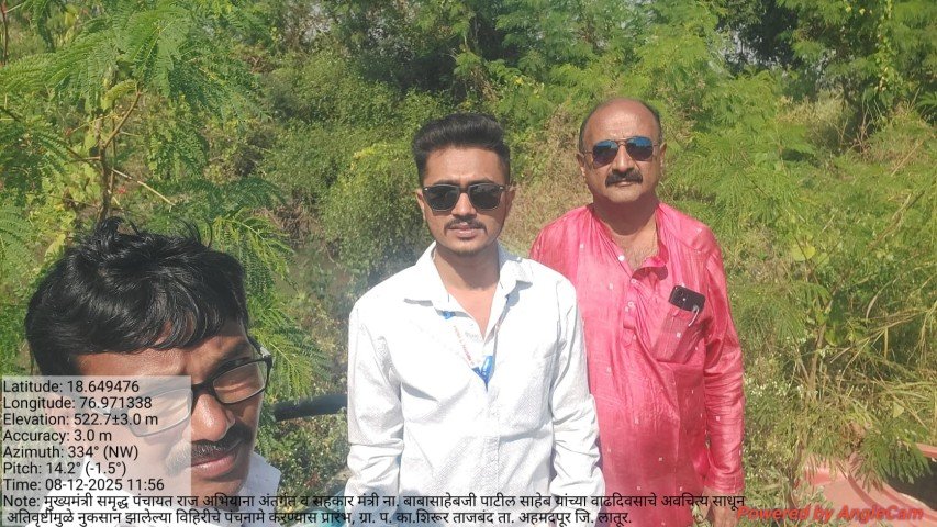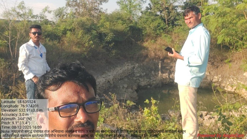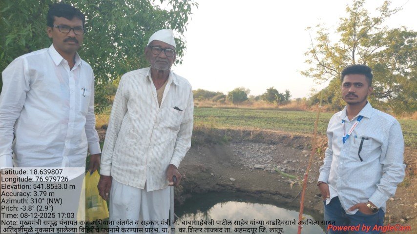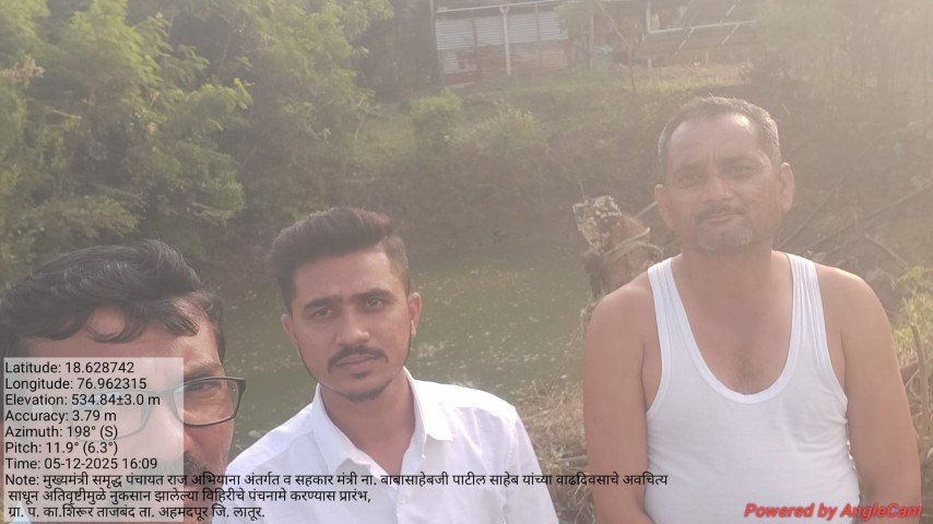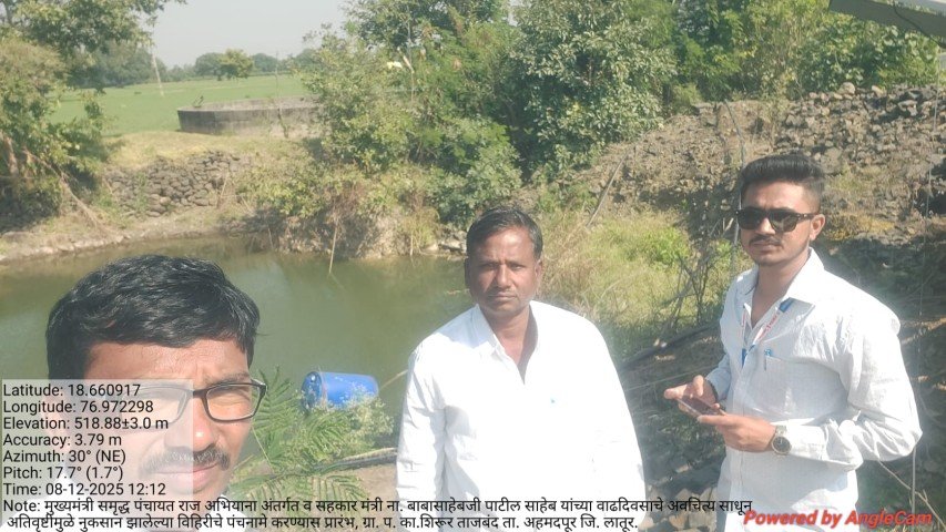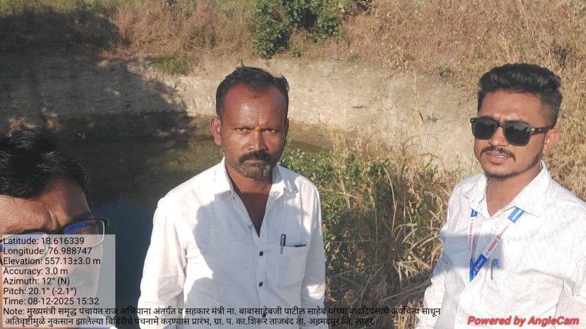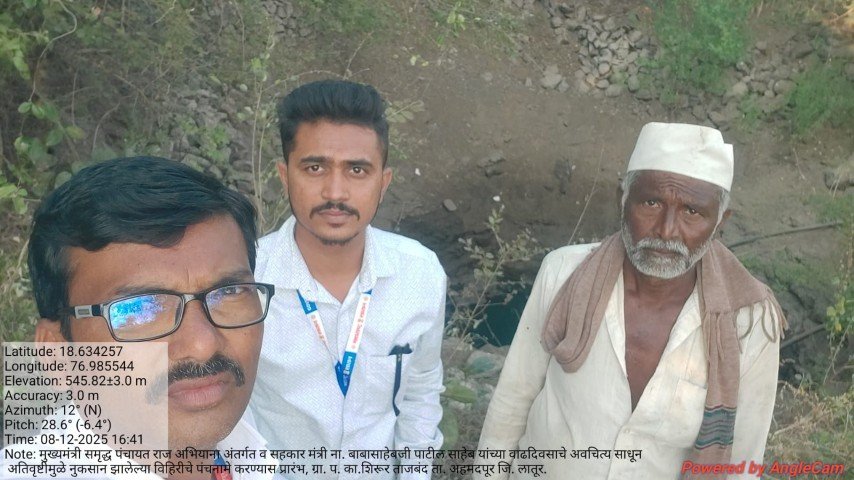 मुख्यमंत्री समृद्ध पंचायत राज अभियाना अंतर्गत व सहकार मंत्री ना. बाबासाहेबजी पाटील साहेब यांच्या वाढदिवसाचे अवचित्य साधून ग्रा. प. का.शिरूर ताजबंद ता. अहमदपूर जि. लातूर. यांच्या वतीने अतिवृष्टीमुळे नुकसान झालेल्या विहिरीचे पंचनामे करण्यास प्रारंभ, यावेळी पंचनामे करतेवेळी नारेगा अभियंता वैभव राठोड सर , ग्राम रोजगार सहाय्यक धर्मपाल सरवदे व शेतकरी बांधव उपस्थित होते